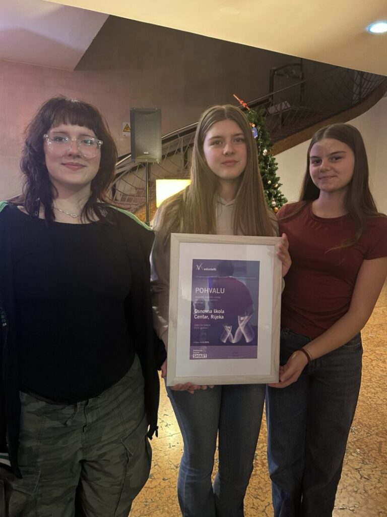 Na svečanosti održanoj u petak 5. prosinca u atriju HKD-a sudjelovale su predstavnice školskog volonterskog kluba “Volontiram-profitiram” te su u pratnji učiteljice Biljane Žutelija primile pohvalu za našu školu. Ova pohvala vrijedna je zbog toga jer duboko vjerujemo u to da zajednicu možemo malim koracima mijenjati nabolje ako pomažemo, darujemo svoje vrijeme poklanjamo pažnju drugima i pomažemo si međusobno. U našoj su školskoj zajednici volonterskim djelovanjem kroz akcije bili uključeni ne samo učenici u učitelji, već svi djelatnici i roditelji te ćemo tako nastaviti i dalje. Bilo nam je neizmjerno drago vidjeti na ovoj svečanoj prigodi i ostale volonterske udruge i članove te ovim putem čestitamo Međunarodni dan volontera svim pohvaljenim volonterkama i volonterima, svim dobitnicama i dobitnicima nagrade i svim drugim volonterima i volonterkama koje mijenjaju naš svijet nabolje.