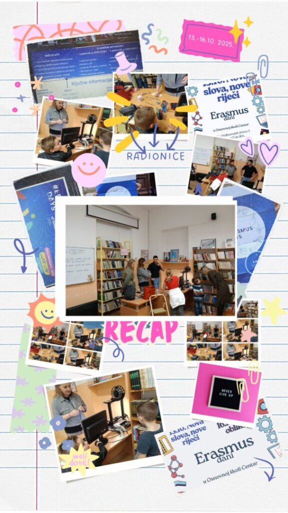 Tijekom 13. listopada učenici su prisustvovali radionici izrade zdrave hrane, u utorak 14. listopada smo održali radionicu 3D printanja na kojoj su sudjelovali bivši i budući učenici, u srijedu smo svi zajedno naučili nove riječi na novom pismu, a u četvrtak smo spojili oblikovanje u glini i mindfulness. Tijekom Erasmus Dana, ravnateljica je prezentirala naš školski Erasmus projekt na Teach meet događanju. Zahvaljujući Erasmus danima, tijekom ovog tjedna svi su naučili nešto novo, zabavili se i razmijenili iskustva stečena kroz Erasmus+ program.
