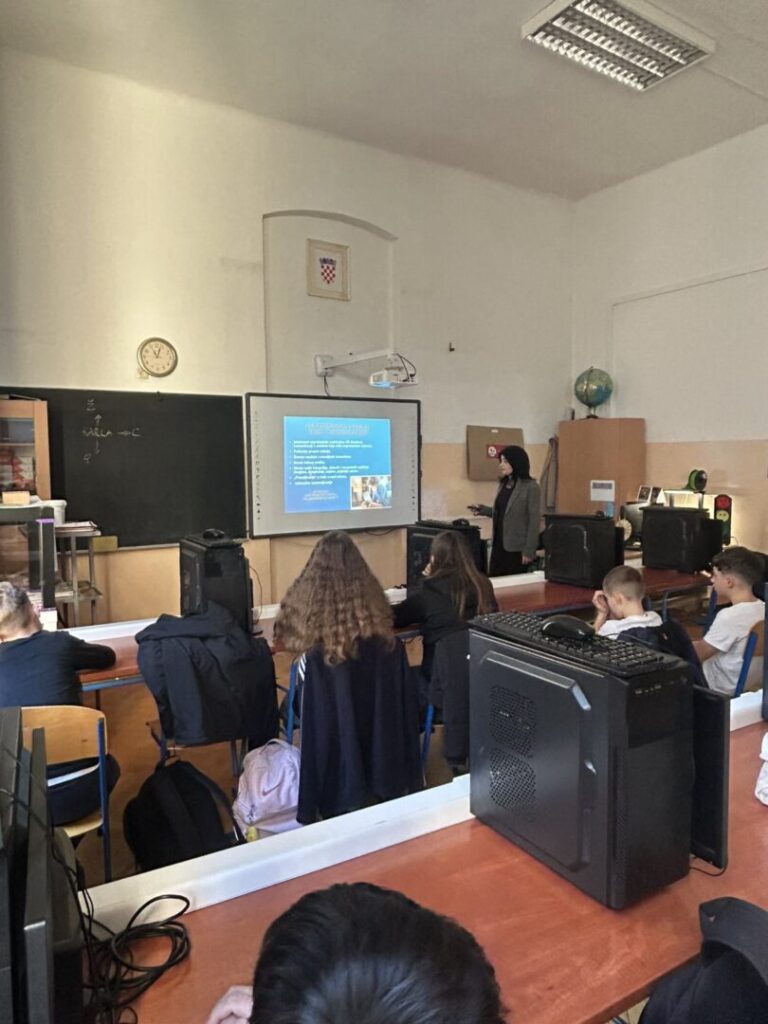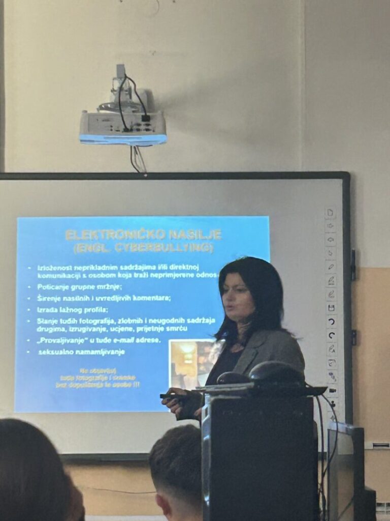 Samostalna policijska službenica za poslove prevencije u četvrtak 12.12. održala je predavanje o elektroničkom nasilju učenicima sedmog razreda. U razgovoru s učenicima skrenula je pozornost na samozaštitu i kako se ponašati u prilikama neprimjerene elektroničke komunikacije, što se nadovezalo i na nastavni sat Informatike. Predavanje je održano s ciljem prevencije neprihvatljivih ponašanja mladih kao i upoznavanja mladih s prednostima, ali i opasnostima koje donosi Internet.