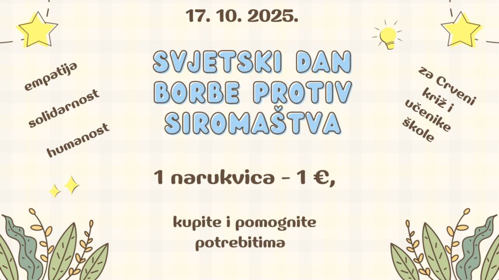 U našoj školi, obilježili smo ovaj dan dobrotvornom akcijom „1 narukvica, 1 euro“. Na satu vjeronauka, vjeroučiteljica i pedagoginja održale su edukativnu radionicu za učenike 5. i 6. razreda, o važnosti pomaganja bližnjima. Učenici su pogledali animirani film „Planet u glavu“ i online izložbu fotografija „Where children sleep“ s ciljem osvještavanja što sve utječe na siromaštvo pojedinih naroda i kako žive druga djeca diljem svijeta. Blok sat smo završili diskusijom i likovnim izričajem na temu.