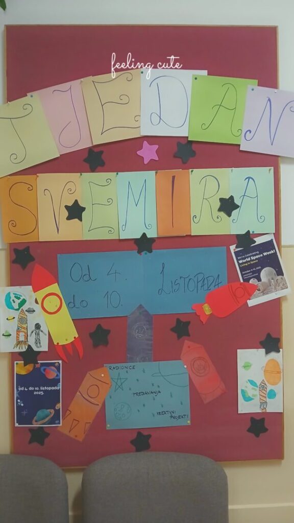 Naša škola i ove se godine uključila u obilježavanje Svjetskog tjedna svemira (World Space Week), najveće svjetske manifestacije posvećene svemirskoj znanosti i tehnologiji, koja se održava od 4. do 10. listopada 2025. s temom „Živjeti u svemiru“. Ova globalna inicijativa, koju podržavaju Ujedinjeni narodi, istražuje kako bi ljudski život mogao izgledati izvan Zemlje – od svemirskih postaja i održivih staništa do budućih misija na Mjesec i Mars. Hrvatska se prošle godine svrstala među najuspješnije zemlje svijeta u obilježavanju ovog događaja, a i ove godine cilj je uključiti što više škola, vrtića i udruga u svemirske radionice, predavanja, natječaje i promatranja zvijezda.